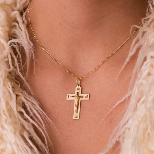 18k cruz oro amarillo brillo y mate con Cristo 32 × 20 mm